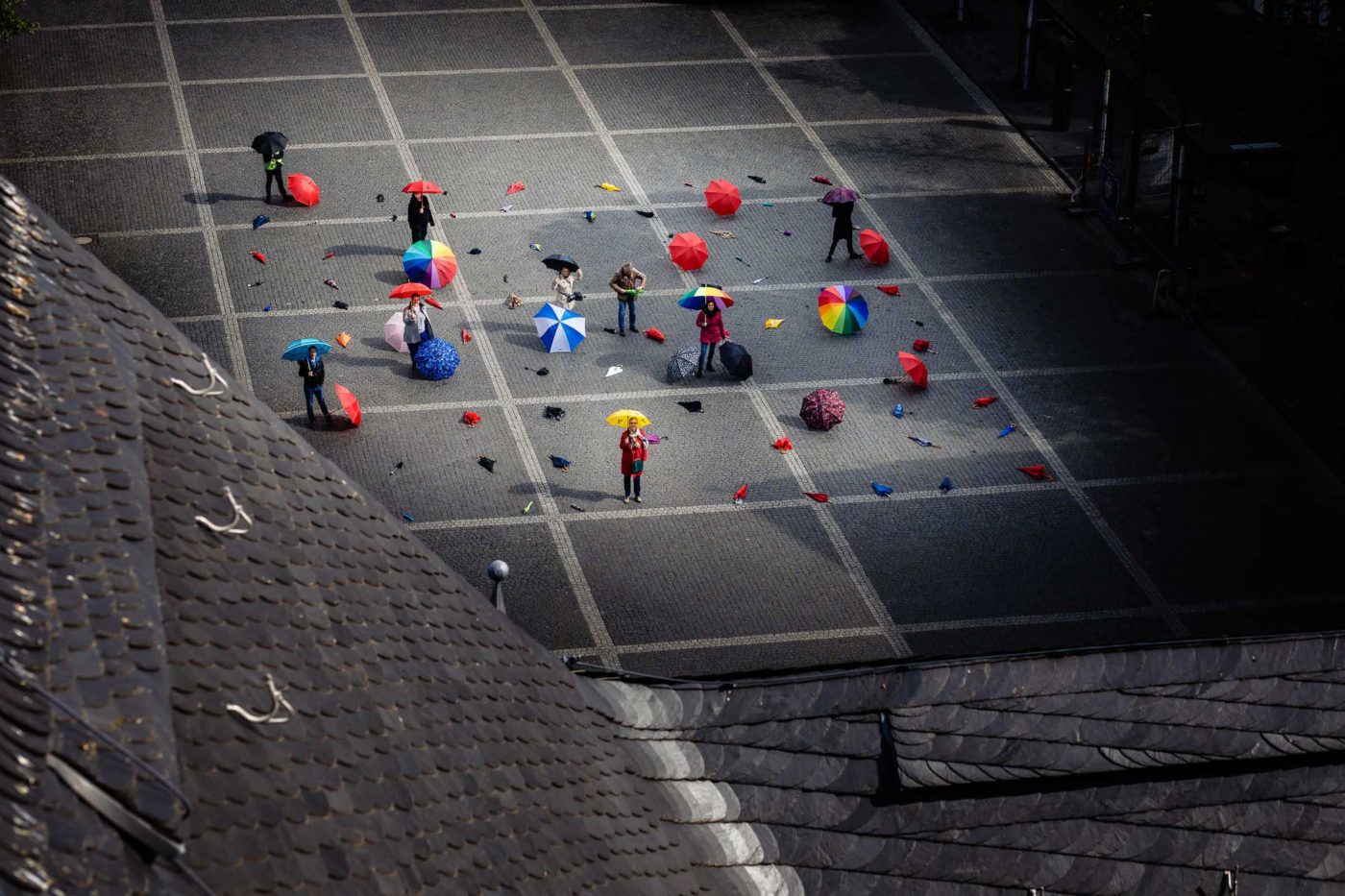 In einer eindringlichen Aktion wurden heute 100 symbolische „Rettungsschirme“, stellvertretend für die Akteur*innen, auf dem Katschhof aufgespannt. Die Lage für die Kreativen ist angesichts der Corona-Krise dramatisch. Viele Existenzen hängen am seidenen Faden (aus der Presseerklärung der Kandidatin Sibylle Keupen für das Amt des Aachener Oberbürgermeisters).